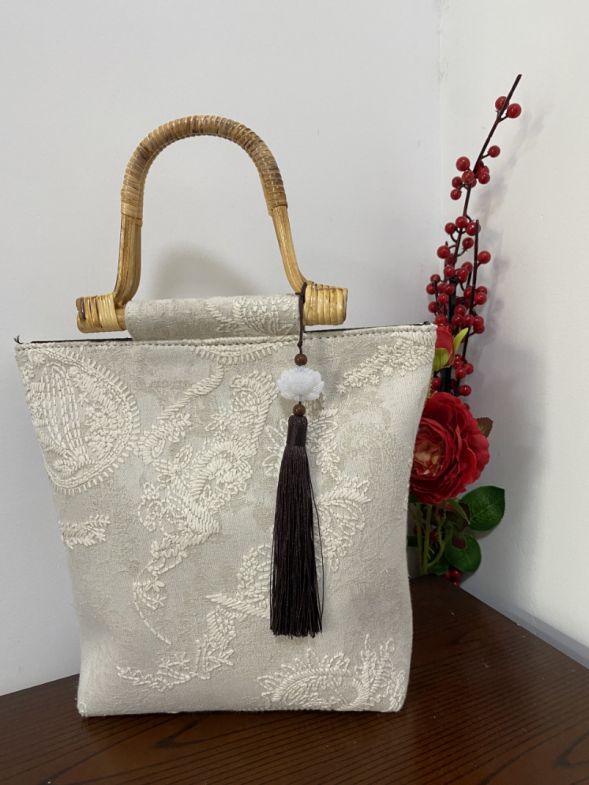 在御麻坊的门市内,一副亚麻提花挂画静静地诉说着品牌的美学追求。画面上,深浅交织的亚麻纱线通过精密的提花工艺,勾勒出充满东方意蕴的缠枝纹样,既有麻料的天然肌理,又展现出不输丝绸的精致质感。除此之外,用御麻坊面料制成的各系列麻料样品包被整齐地码放在桌子上。